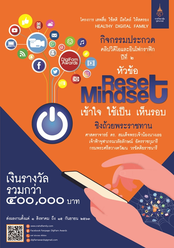 กิจกรรมประกวดคลิปวิดีโอและอินโฟกราฟิก ปีที่ 2 หัวข้อ "Reset Mindset เข้าใจ ใช้เป็น เห็นรอบ" ชิงถ้วยพระราชทาน ศาสตราจารย์ ดร. สมเด็จพระเจ้าน้องนางเธอเจ้าฟ้าจุฬาภรณวลัยลักษณ์ อัครราชกุมารี กรมพระศรีสวางควัฒน วรขัตติยราชนารี เงินรางวัลรวมกว่าง 400,000 บาท