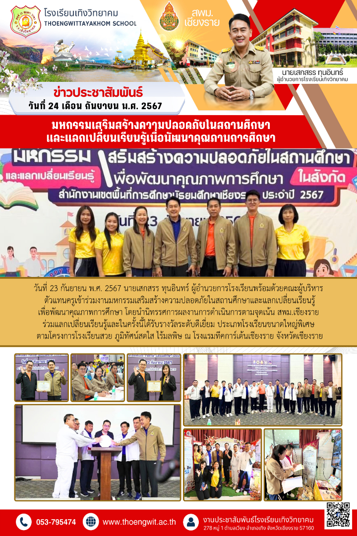 มหกรรมเสริมสร้างความปลอดภัยในสถานศึกษาและแลกเปลี่ยนเรียนรู้เพื่อพัฒนาคุณภาพการศึกษา นางสาวจิราวรรณ เรือนสิทธิ์ 24 กันยายน 2567 กลุ่มบริหารงานวิชาการ เข้าชม : 486