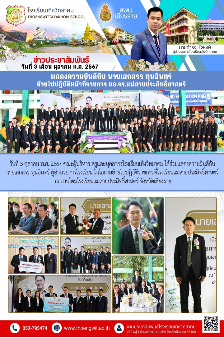 แสดงความยินดีกับ นายเสกสรร ทุนอินทร์ ย้ายไปปฏิบัติหน้าที่ราชการ ผอ.รร.แม่สายประสิทธิ์ศาสตร์ นางสาวจิราวรรณ เรือนสิทธิ์ 3 ตุลาคม 2567 กลุ่มบริหารงานอำนวยการ เข้าชม : 643