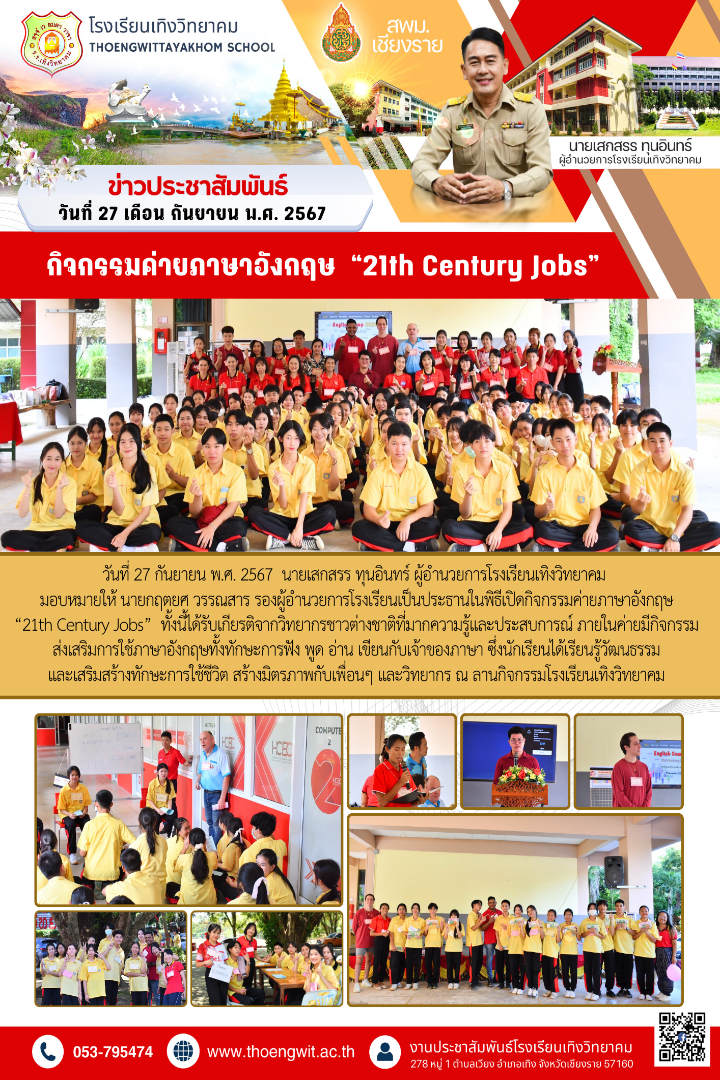 กิจกรรมค่ายภาษาอังกฤษ “21th Century Jobs” นางสาวจิราวรรณ เรือนสิทธิ์ 27 กันยายน 2567 กลุ่มบริหารงานวิชาการ เข้าชม : 540