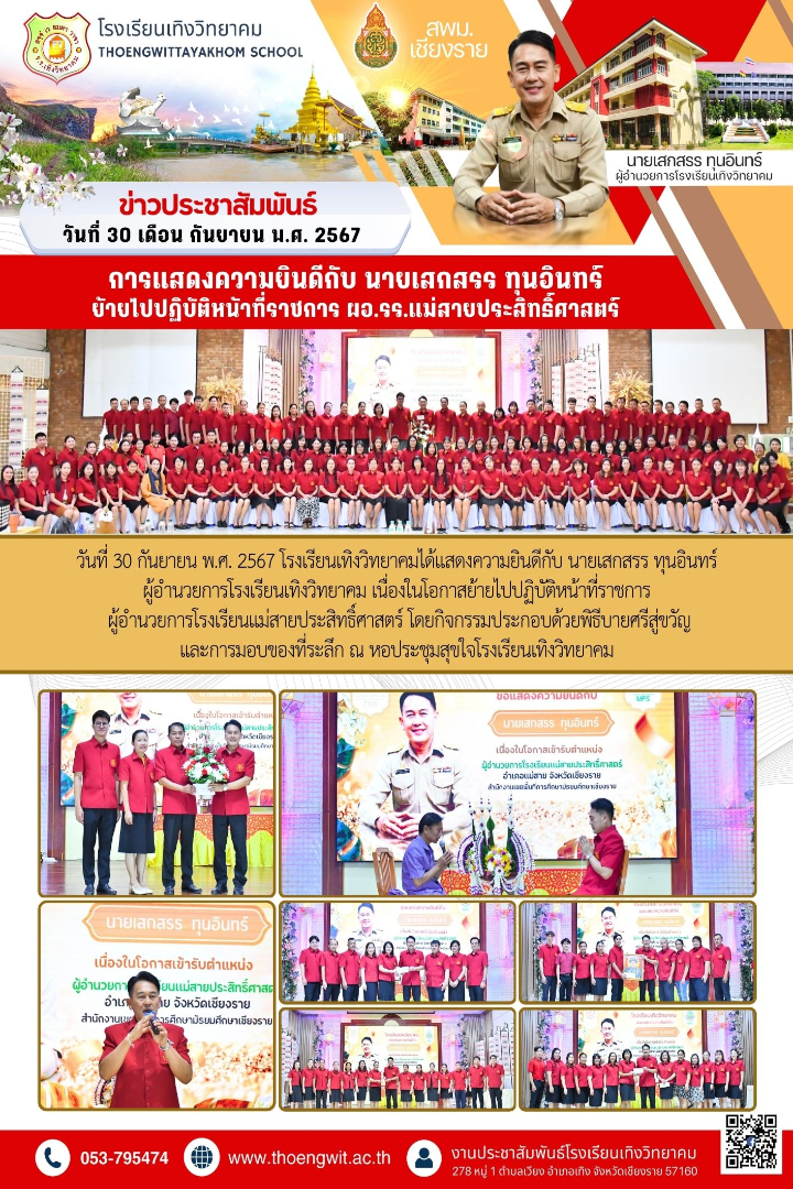 การแสดงความยินดีกับ นายเสกสรร ทุนอินทร์ ย้ายไปปฏิบัติหน้าที่ราชการ ผอ.รร.แม่สายประสิทธิ์ศาสตร์ นางสาวจิราวรรณ เรือนสิทธิ์ 30 กันยายน 2567 กลุ่มบริหารงานอำนวยการ เข้าชม : 567