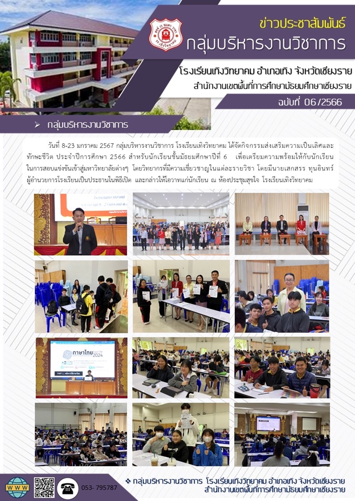 ส่งเสริมความเป็นเลิศและทักษะชีวิต สำหรับนักเรียนชั้นมัธยมศึกษาปีที่ 6 ปีการศึกษา 2566 นายโยธิน ศิริเอ้ย 12 มกราคม 2567 กลุ่มบริหารงานวิชาการ เข้าชม : 772