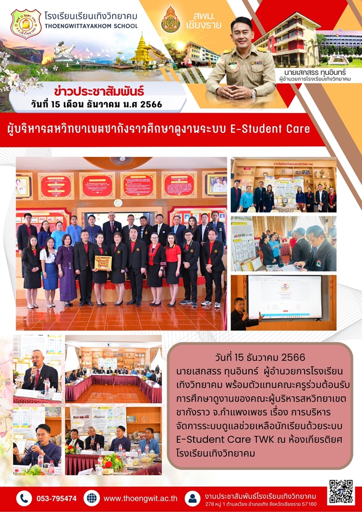 ผู้บริหารสหวิทยาเขตชากังราว จังหวัดกำแพงเพชร ศึกษาดูงานระบบ E-Student CARE นายโยธิน ศิริเอ้ย 16 ธันวาคม 2566 กลุ่มบริหารงานกิจการนักเรียน เข้าชม : 13275