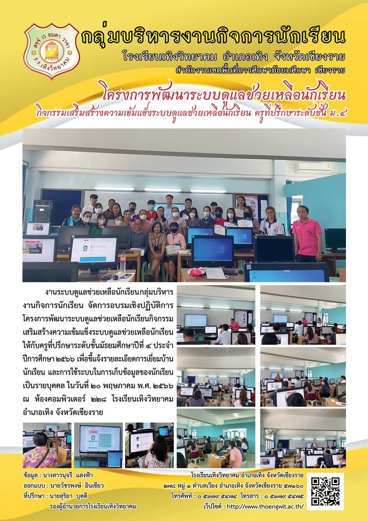 อบรมเชิงปฏิบัติการโครงการพัฒนาระบบดูแลช่วยเหลือนักเรียน ระดับชั้นมัธยมศึกษาปีที่ 4 ปีการศึกษา 2566 นายโยธิน ศิริเอ้ย 26 กรกฎาคม 2566 กลุ่มบริหารงานกิจการนักเรียน เข้าชม : 699